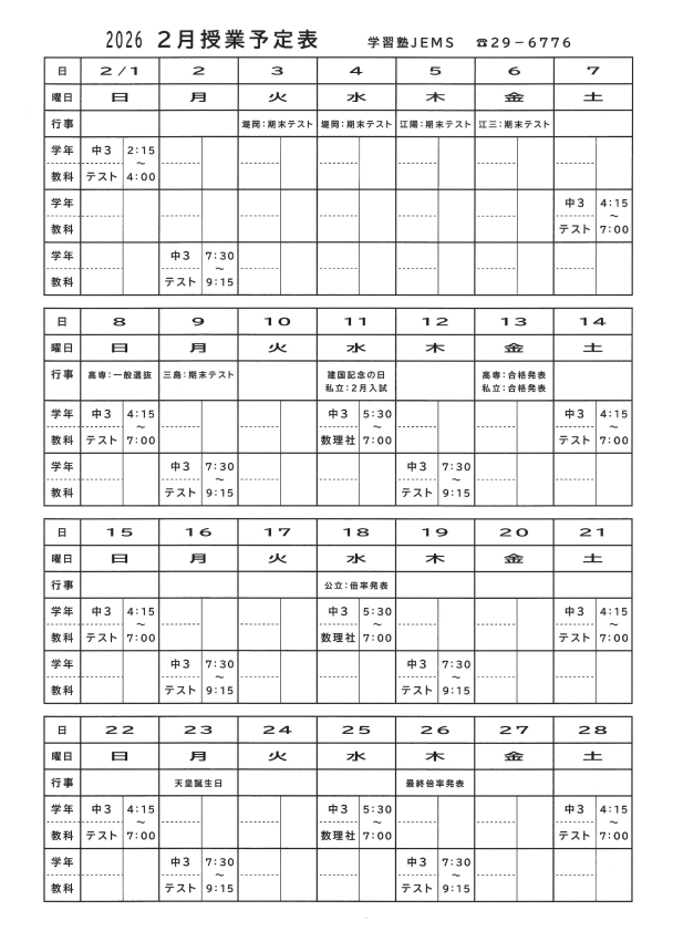 ※1月~3月は授業時間が大幅に増加するため(1月は週4日、2月は期末テスト後から週5日、土・日は3時間授業)、受講料が月割りから日数割に変更になります。(19,000円/12日)